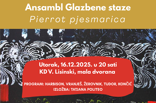 Ansambl Glazbene staze održat će treći koncert u okviru ciklusa Glazbene staze u Maloj dvorani Vatroslava Lisinskog, u utorak, 16. prosinca, s početkom u 20 sati.